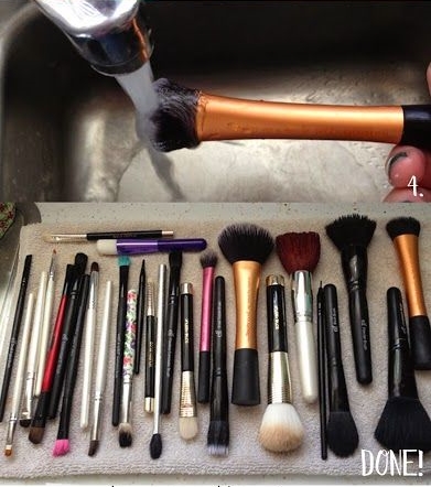 มาเข้าสู่ขั้นตอนของการล้างแปรงเลยดีกว่า ก่อนอื่นเลย ขอให้เธอย้ายก้นพร้อมแปรงแต่งหน้าของเธอทั้งหมดไปอยู่ใกล้ๆแหล่งน้ำ เช่น ซิงค์ล้างจาน ก๊อกน้ำอ่างล้างหน้า ง่ายๆ แค่เธอเทส่วนผสมทุกอย่างลงไป คนๆ ผสมกันให้เรียบร้อย จากนั้นเอาแปรงเน่าๆ ของเธอ จุ่มหัวมันลงไปโลด! (ใครเอาด้ามทิ่มลงไปเดี๋ยวแม่จกตาเยยย)