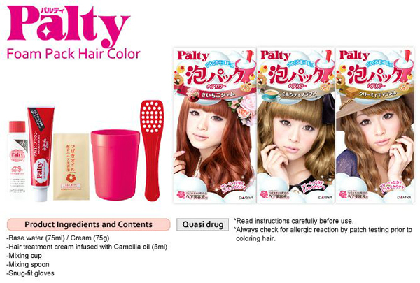 ต่อกันด้วยโฟมเปลี่ยนสีผมจาก Palty Foam Pack Hair Color มีหลายเฉดสีให้เลือกย้อม มีส่วนผสมจากน้ำมันมะกอกบริสุทธิ์ และน้ำมันมะกอกสควาเลนช่วยฟื้นฟูผมเสียให้กลับมานุ่มสวยอีกครั้ง พร้อมทั้งมีโปรตีนจากธรรมชาติช่วยเคลือบปิดเกล็ดผมไม่ให้เส้นผมแห้งแตกปลายจากการโดนความร้อนและสารเคมี มีอุปกรณ์มาให้พร้อมในกล่อง ทั้งwater base ครีมเปลี่ยนสีผม ถ้วยผสม หวีแปรง และทรีตเมนต์ปรับสภาพผม