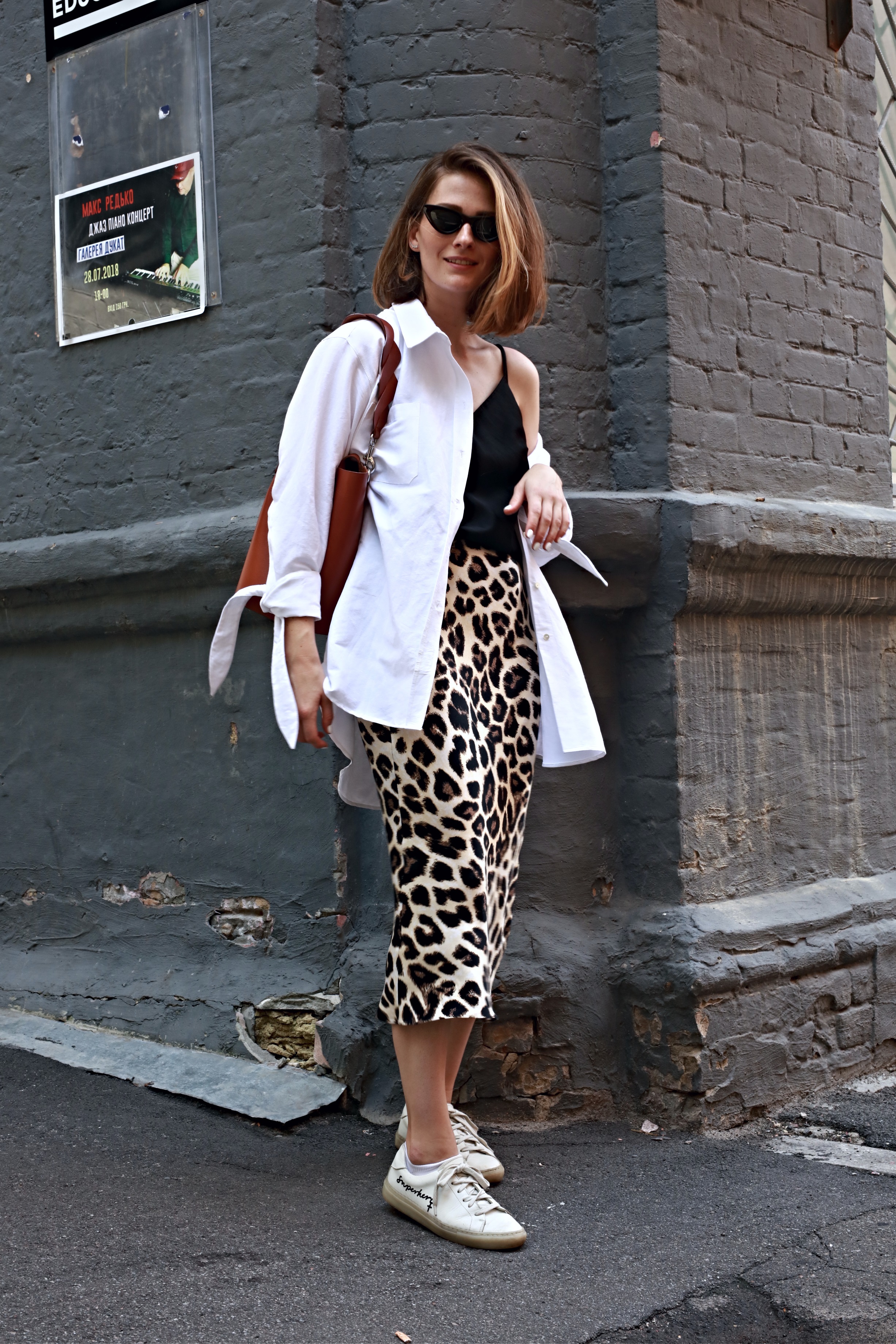 17. กระโปรงลายเสือเสื้อครอปแขนยาวและรองเท้าผ้าใบเจ๋งๆ