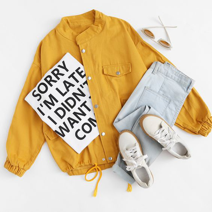 บอมเบอร์แจ็กเก็ตสีเหลืองกับกางเกงยีนส์ก็เข้ากันนะ