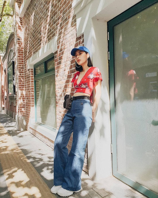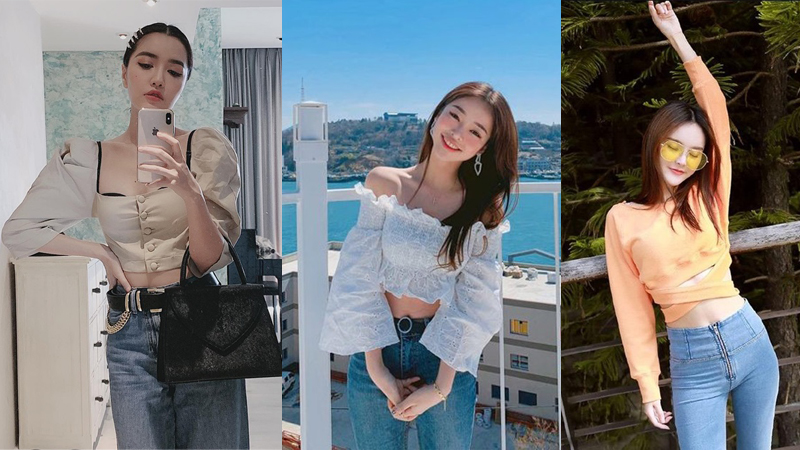 19.เสื้อครอปปาดไหล่น่ารักๆ กับกางเกงยีนส์ทรงตรงที่เป็นที่นิยม