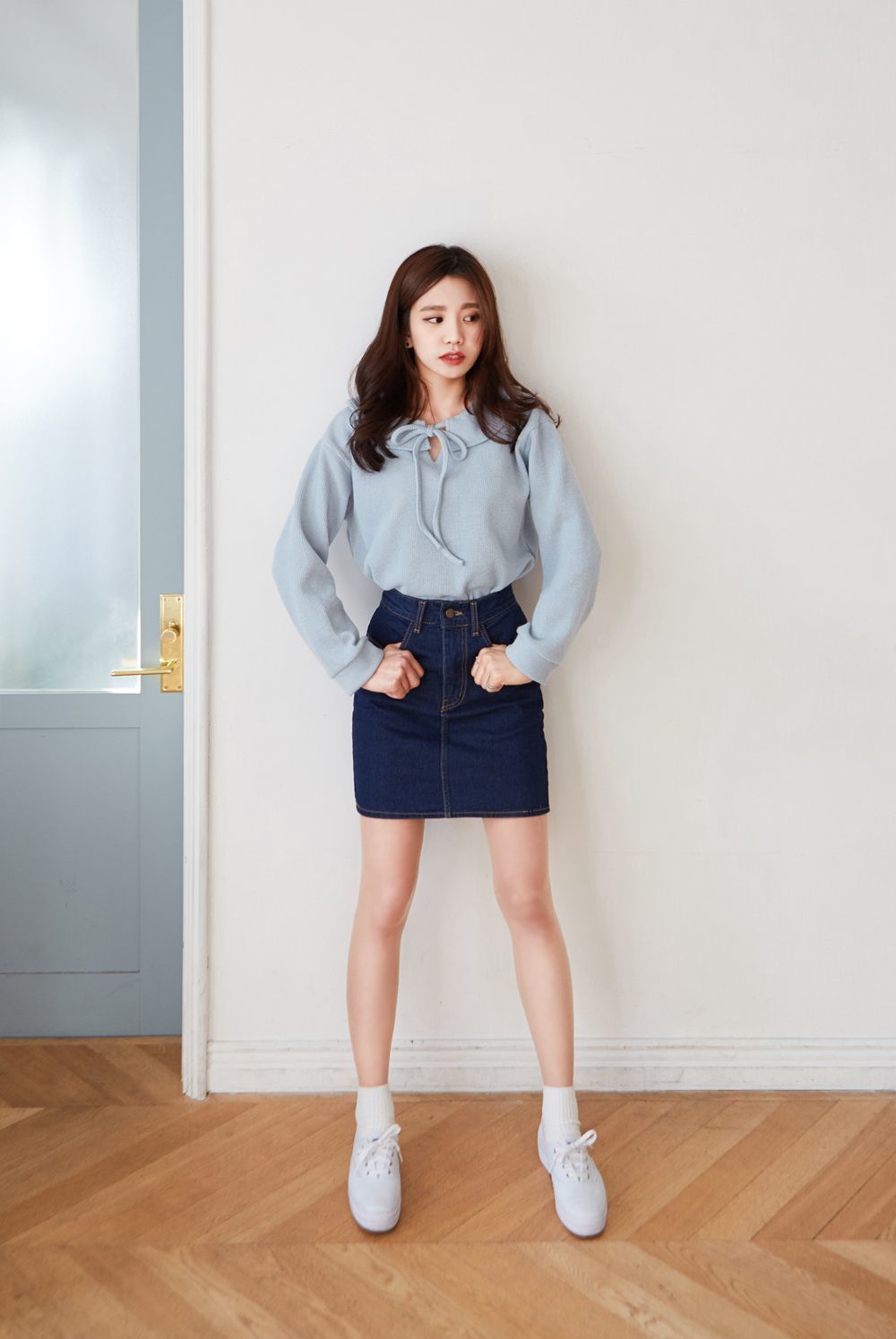 5. เสื้อแขนยาวสีฟ้าอ่อนกับกระโปรงยีนส์