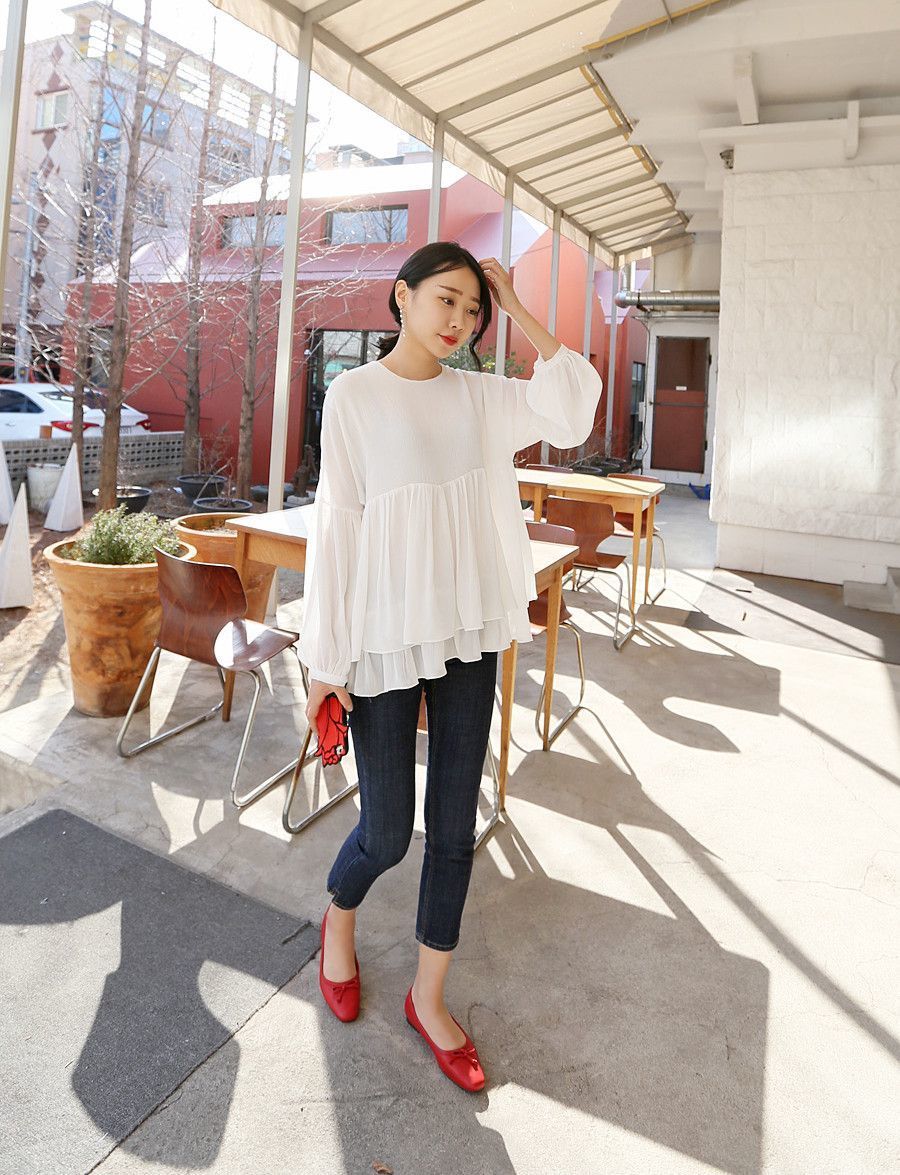 7. เสื้อแขนยาวแบบระบายกับสกินนี่ยีนส์