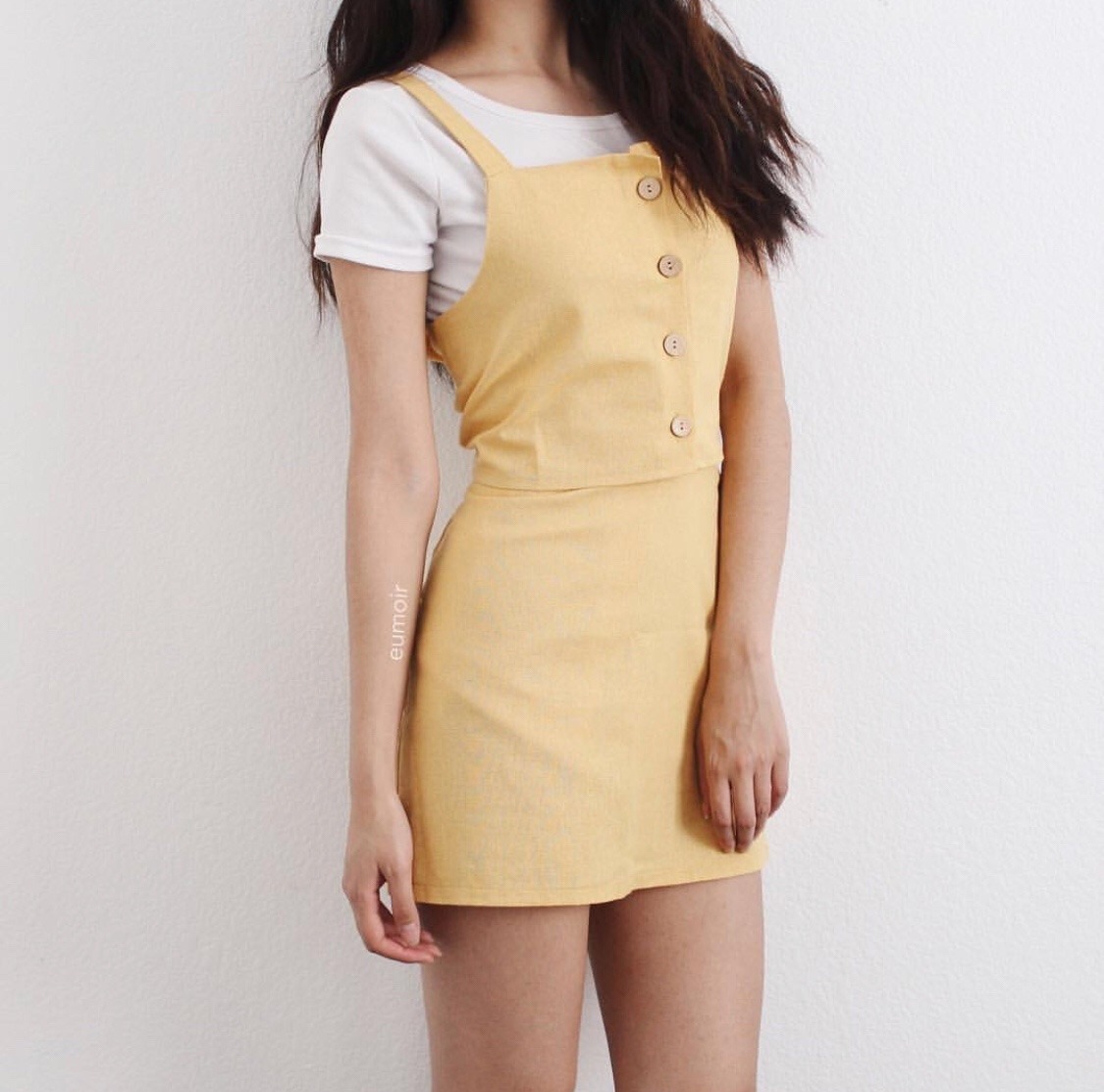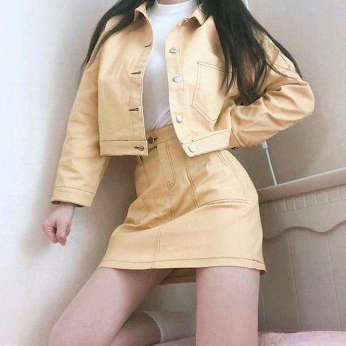 1. เสื้อคลุมแมทช์กับกระโปรงเอวสูง สีเหลืองคือคิวท์มาก