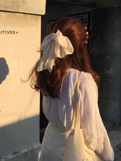 ทรงผมยาวยาวมัดรวบครึ่งหัว ผุกโบว์ผ้าใหญ่สีขาว