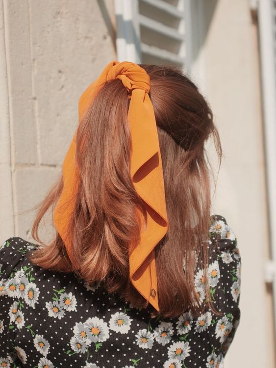 สีส้มสดใสกับทรงผมสั้นประบ่า มัดรวบครึ่งหัว ผูกด้วยโบว์สีส้ม