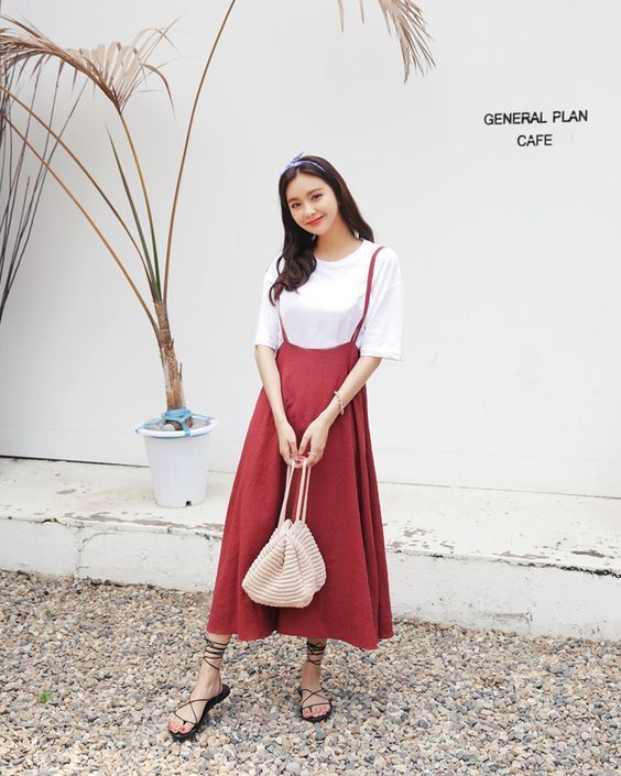 30 เสื้อแขนสั้นสีขาวทับด้วยเดรสสายเดี่ยวสีแดงคิวท์ๆ