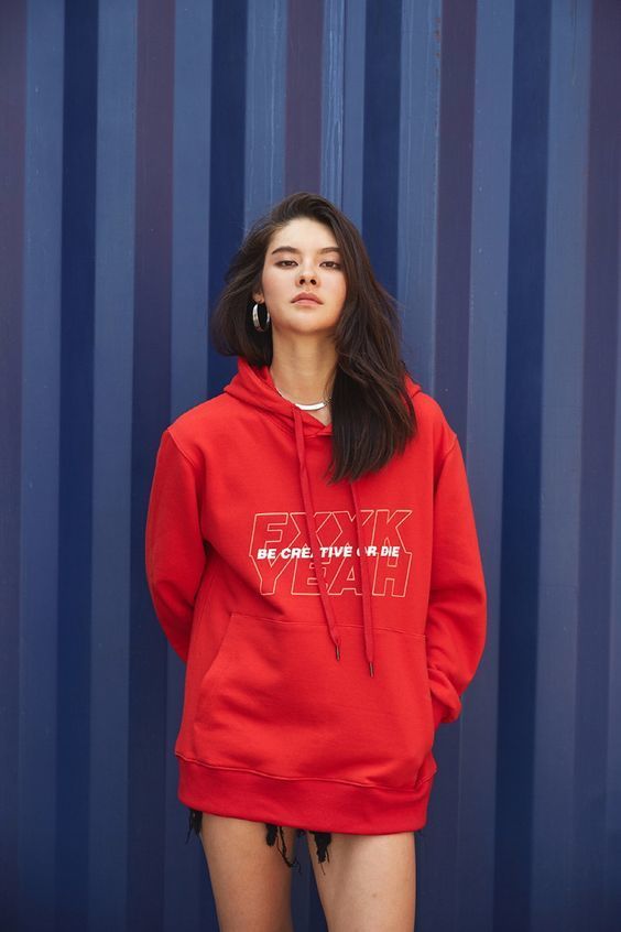 5 เสื้อฮู้ดสีแดงกับกางเกงขาสั้นปลายรุ่ยๆ