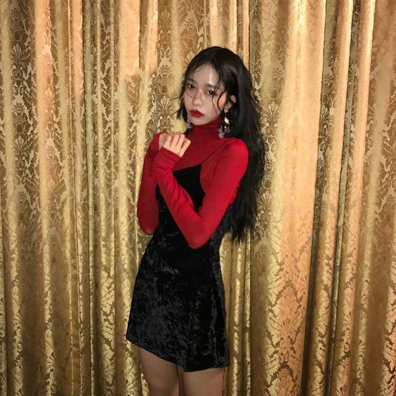 29 เสื้อแขนยาวสีแดงใส่เข้าในเดรสผ้ากำมะหยี่สีดำ