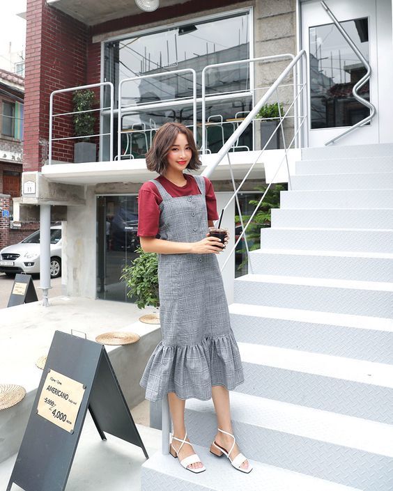 12 เสื้อยืดสีขาวทับด้วยเดรสลายตารางสีแดงผ่าข้างน่ารักสุด