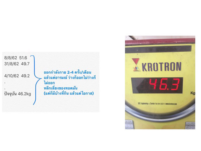สำหรับเราความผอมมันไม่ได้ขึ้นอยู่กับตัวเลขบนตราชั่งเสมอไปค่ะ ตัวเลขที่ชั่งได้ 52.2 kg. มันไม่ใช่ค่าที่การันตีว่าเป็นมวลที่แท้จริงค่ะ อาจจะเป็นเพราะว่าตอนนั้นเราดื่มน้ำเยอะ, ใส่เสื้อผ้าตัวหนา แต่ที่สังเกตได้คือ สัดส่วนลดลงไปมากค่ะ