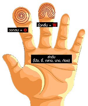 จากภาพ คือสองรูปแบบที่แตกต่างกันของวงกลมและริ้วคลื่นที่เห็นได้จากทุกนิ้ว การอ่านให้เริ่มอ่านจากนิ้วโป้งก่อน แล้วค่อยไปที่นิ้วชี้ นิ้วกลาง นิ้วนางและนิ้วก้อยตามลำดับ