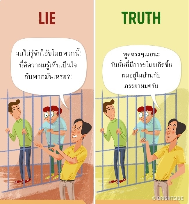 เรื่องอธิบายน่ะไม่ซับซ้อน แต่พอให้มาพูดเล่าเรื่องจริงจัง นางจะเรียงคำไม่ค่อยถูก ฟังแล้วมันจะต้องมีคำถามในหัวของเราอีกทีว่า ห๊ะ อะไรนะ อธิบายใหม่ซิ อีกอย่างที่จะจับได้ตอนเราคั้นคือน้ำเสียงมันจะไม่เหมือนเดิม มันจะดูมีระดับมากขึ้น เพราะเหมือนเราต้อนอะ คนมันจะจนมุมมันก็จะเริ่มออกฤทธิ์ไง แบบเธอไม่เชื่อฉันเหรอ ไรงี้แหละ
