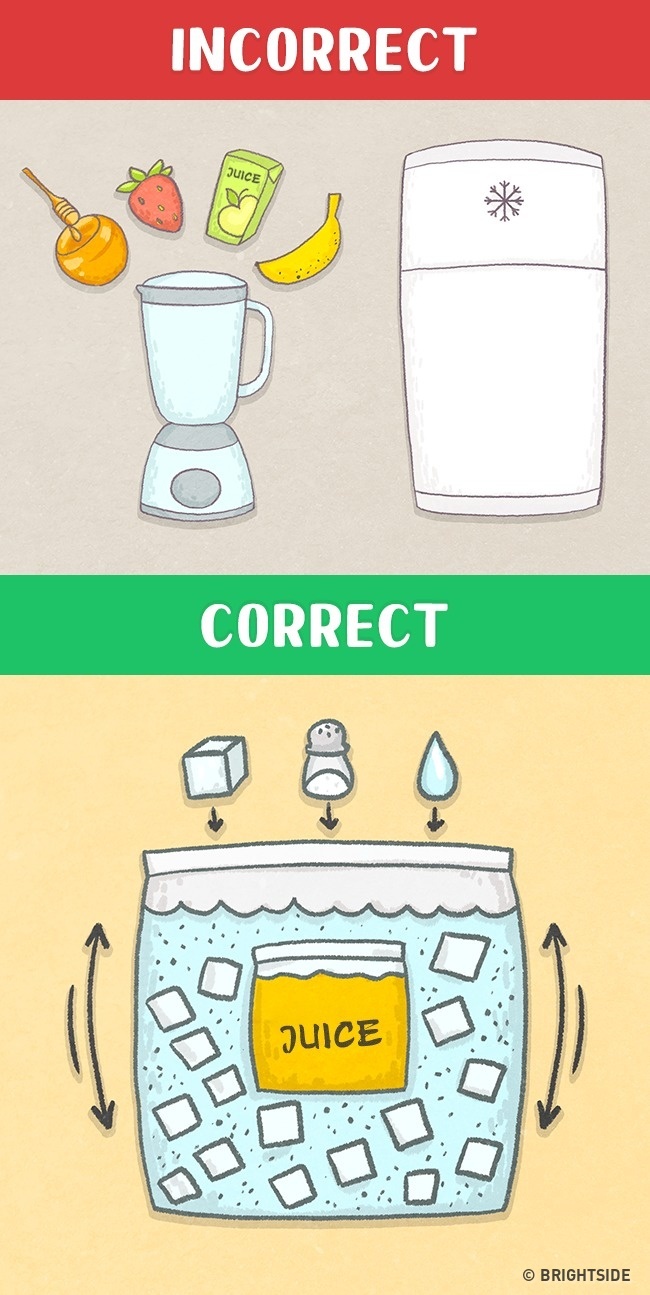 เทน้ำเปล่าลงไปในชาม ใส่น้ำแข็ง 2 ถ้วย และเกลือ 1 ถ้วย จากนั้นก็แช่กระป๋องน้ำอัดลมไว้ในนั้น และคนให้เข้ากันจนมันเย็นก็ดื่มได้เลย