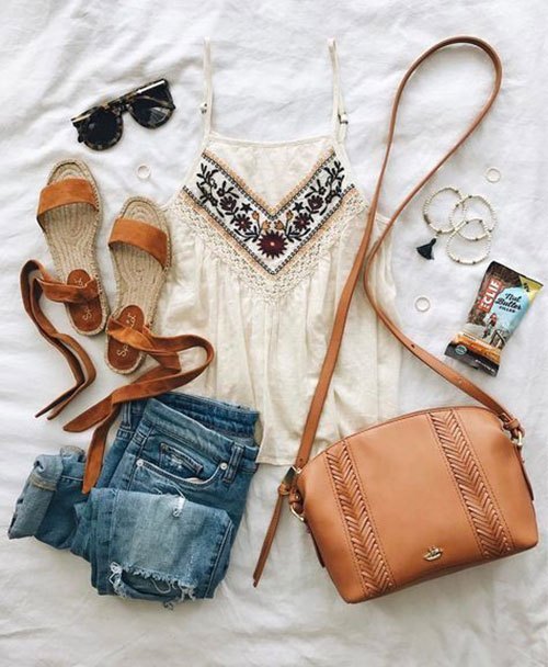รองเท้าแตะที่ทำจากหนังช่วยให้เราดูไม่เซอร์เกินไป เสื้อยืดขาว ขาสั้นเนื้อเบาๆ สีสันสดใส กับกระเป๋าสานให้ความรู้สึกเหมือนไปทะเล
