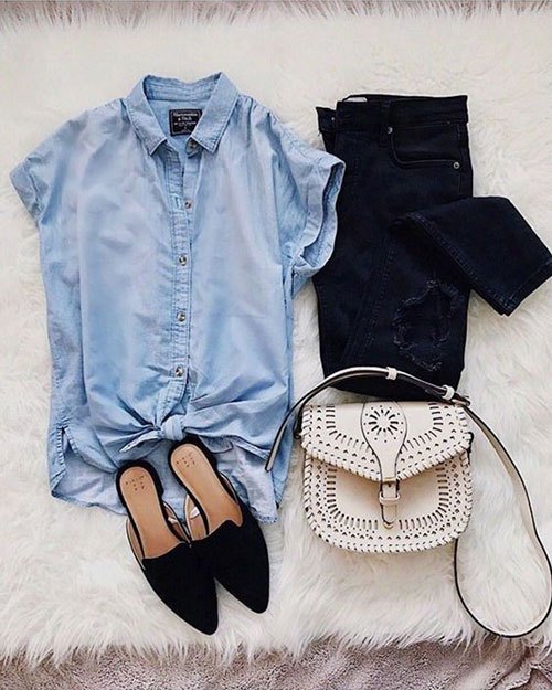 เสื้อเชิ้ตสีขาวผ้าคอตต้อน กับกางเกงยีนส์เดนิมขาสั้น พร้อมด้วยรองเท้าส้นเตี้ยแบบหุ้มส้น จับคู่กับแอคเซสเซอรี่สีเข้ากัน ทั้งแว่น นาฬิกาและแหวน ดูสบายแต่เรียบหรู