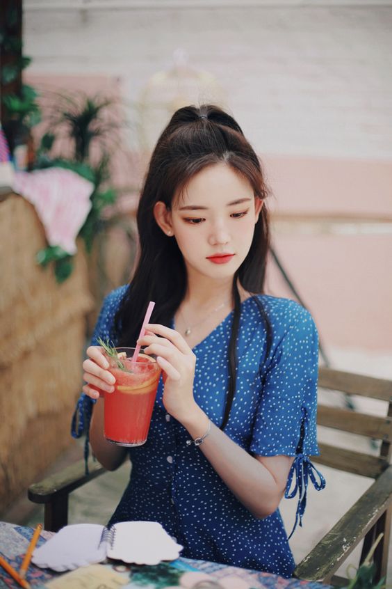 เรียบ ง่าย แต่ดูดี กับทรงผมยาวดัดลอนคลายๆ มาพร้อมกับที่คาดผมสีฟ้า