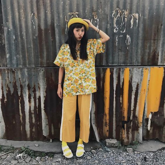 คุมโทนสีเหลืองแบบไม่จี๊ดตาไป โดยการลดความเข้มของสีลง จากสไตล์แมทช์กางเกงผ้าขายาวสีเหลือง แต่งแถบข้างสีขาว คู่เชิ้ตแขนสั้นลายดอกสีเหลืองบนพื้นขาว ปล่อยผมแล้วสวมหมวกเบเร่ต์สีเหลือง รองเท้าแตะแบบคาดเท้าสีขาวคู่ถุงเท้าสีเหลือง
