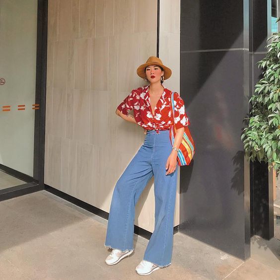 ชุดแมทช์ยีนส์ขายาวเอวสูงขากระบอก คู่เชิ้ตแขนสั้นลายดอกบนพื้นสีแดงให้ฟีลอะโลฮ่ามากจ๊ะซิส บวกหมวกสานปีกกว้าง กระเป๋าผ้าลายทางสีรุ้ง และผ้าใบสีขาว