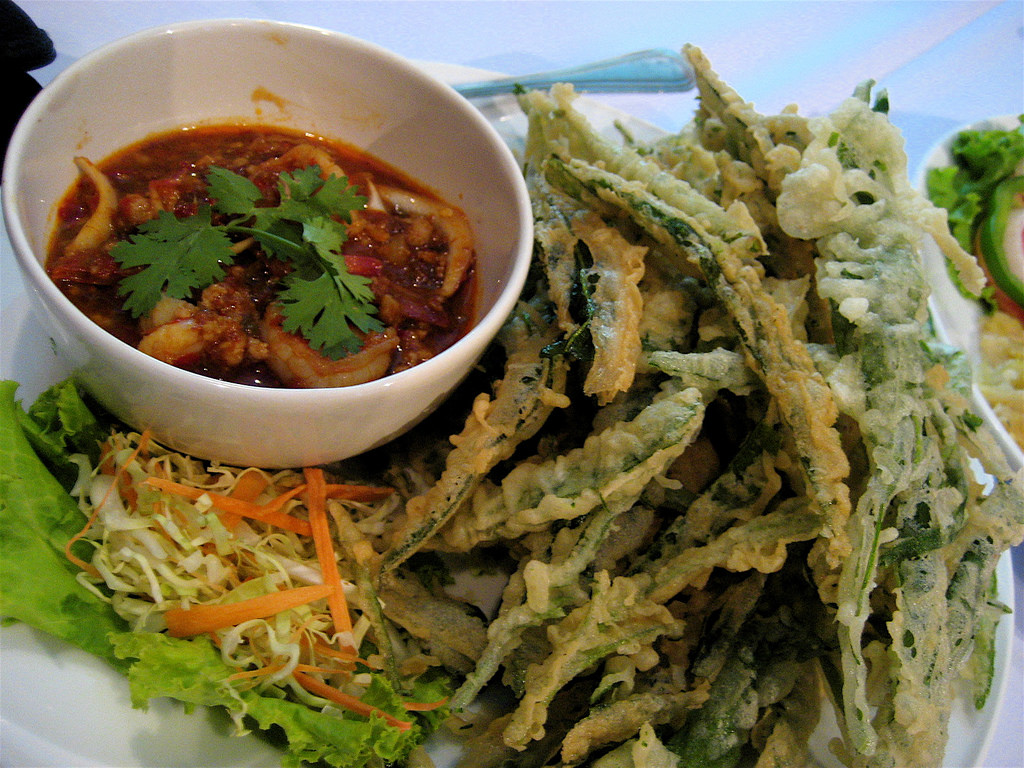 3.ตั้งกระทะใส่น้ำมันท่วม นำผักบุ้งที่เตรียมไว้ลงชุบแป้งแล้ว ลงไปทอดจนมีสีเหลืองกรอบ (โดยใช้ไฟกลางๆ) แป้งสุกกรอบดี ก็ตักขึ้นพักไว้ให้สะเด็ดน้ำมัน