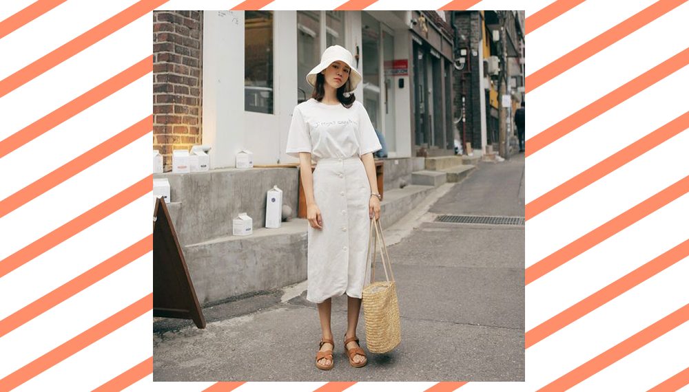 ใส่หมวก Bucket ก็ดูหวานได้ จับคู่กับเสื้อ และกระโปรงสีขาว