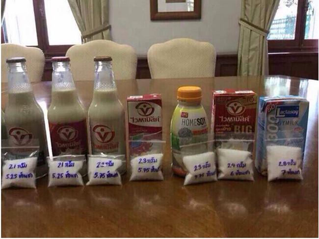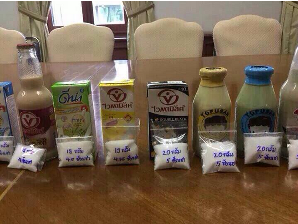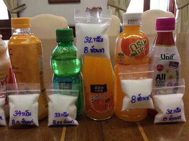 เธอรู้มั้ยว่าน้ำดื่มขวดๆน่ะ ต่อให้เป็นน้ำอะไรก็ตามมันมีน้ำตาลหมดแหละ ไม่ใช่น้อยด้วยจะบอกให้ แค่มีคำว่า 0 กิโลแคลอรี่แปะอยู่หน้าขวดไม่ได้แปลว่าจะดีเสมอไป ในแง่ของการคุมอาหารอาจจะใช้ได้ แต่ในแง่ของสุขภาพจริงๆมันไม่เต็ม 100% อะเธอ เพราะคนไทยส่วนใหญ่ไม่อ่านฉลากไง บางคนก็อ่านแล้วแหละแต่อ่านผ่านๆ เช่น น้ำผักรวมอะ หูย แค่ชื่อก็เฮลท์ตี้สุดๆ พลิกหลังขวดไปอ่านฉลากดูดิ ร้อนๆหนาวๆเลยอะเธอเอ้ย ภาพต่อไปนี้จะเป็นการทำให้เห็นภาพว่าปริมาณในเครื่องดื่มแต่ละชนิดน่ะเป็นยังไง