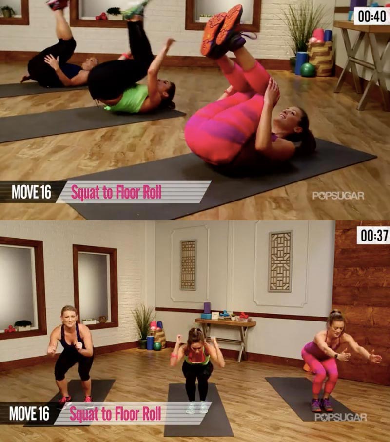 นอนราบลงกับเสื่อโยคะ แล้วชันเข่าขึ้น จากนั้นม้วนตัวขึ้นมาทำท่าสควอต ค้างท่าไว้แล้วย่อตัวลงเบาๆ 5 ครั้ง