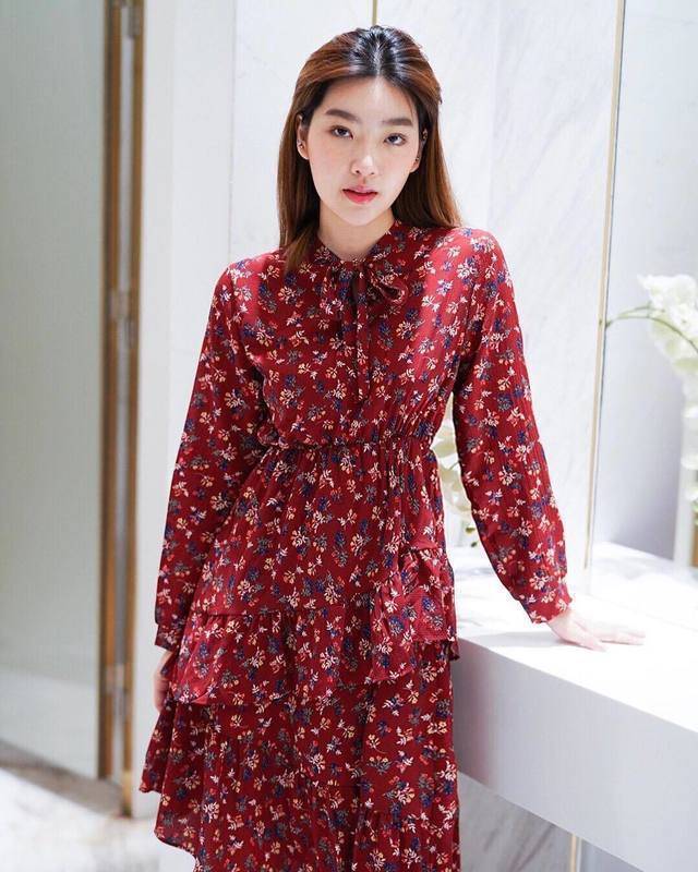4. เดรสลายดอกสีแดง ผ้าพริ้วๆ