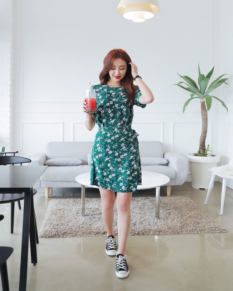 2. เดรสสีเขียวลายดอก เข้ารูปตรงเอว