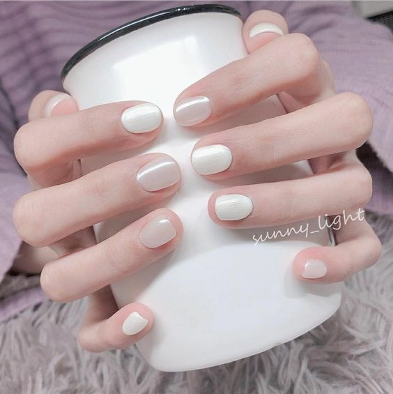 เล็บเจลสีมุกแบบเรียบๆ เติมโคนเล็บด้วยสีชมพูนิดๆ ให้เล็บดูสวยละมุนขึ้น