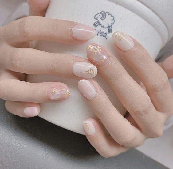 เล็บเจลสีมุกสไตล์เรียบๆ เติมทองคำเปลวเล็กๆ ให้ดูดีมากยิ่งขึ้น