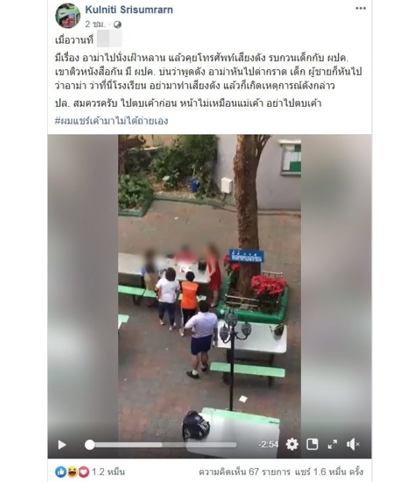 โดยระบุข้อความว่า “เมื่อวาน มีเรื่องอาม่าไปนั่งเฝ้าหลาน แล้วคุยโทรศัพท์เสียงดัง รบกวนเด็กกับผู้ปกครอง เขาติวหนังสือกัน มีผู้ปกครองบ่นว่าพูดดัง อาม่าหันไปด่ากราด เด็กผู้ชายก็หันไปว่าอาม่า ว่าที่นี่โรงเรียน อย่ามาทำเสียงดัง แล้วก็เกิดเหตุการณ์ดังกล่าว”