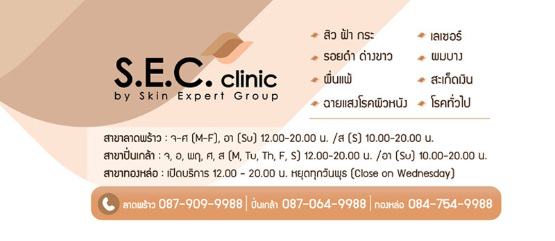 S.E.C Clinic เป็นคลินิกรักษาโรคผิวหนังที่ก่อตั้งมาจากการรวมตัวของกลุ่มอาจารย์และแพทย์เฉพาะทางด้านผิวหนัง ให้บริการรักษาตั้งแต่ปัญหาผิวหนังอย่างผื่นแพ้ ฝ้า กระ ปาน ผื่นลมพิษ เกลื้อนน้ำนม ด่างขาว หูด ไฝ จนถึงโรคสะเก็ดเงินและโรคผิวหนังติดเชื้อต่างๆ ด้วยทีมแพทย์ผู้เชี่ยวชาญ แนะนำวิธีการรักษาที่เหมาะสมกับอาการ โดยมีทั้งการฉายแสงอาทิตย์เทียมหรือแสงอัลตราไวโอเลต นอกจากนี้ยังมีบริการด้านความงามรวมถึงการผ่าตัดผิวหนังสำหรับส่งตรวจชิ้นเนื้อเพื่อวินิจฉัยโรค รักษาเนื้องอกและซีสต์ผิวหนังด้วยค่ะ
