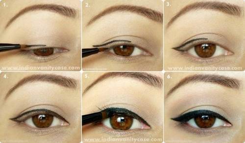 ขั้นแรก เริ่มจากกรีดหางอายไลเนอร์บริเวณหางตาให้สูงขึ้นมาเล็กน้อย