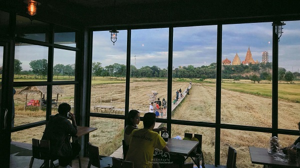 ร้านกาแฟวิวทุ่งนา ที่ ร้านมะขามคาเฟ่ คุณจะได้ชมวิวทุ่งนาอันเขียวขจี ซึ่งทางร้านได้สร้างสะพานไม้ทอดยาวไปตามท้องทุ่งนาอีกประมาณ 200 เมตร เพื่อให้ลูกค้าเดินเล่น ถ่ายรูปและสัมผัสกับธรรมชาติที่งดงามสบายตา ให้ลูกค้ารู้สึกผ่อนคลายลดความเครียด นอกจากนี้ยังสามารถมองเห็นหลวงพ่อพระพุทธรูปองค์ใหญ่วัดม่วงได้อีกด้วย