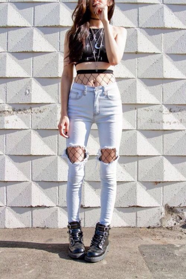 เสื้อเอวลอย กับกางกงยีนส์สีขาวขาดตรงหัวเข่า โชว์ถุงน่องตาข่าย