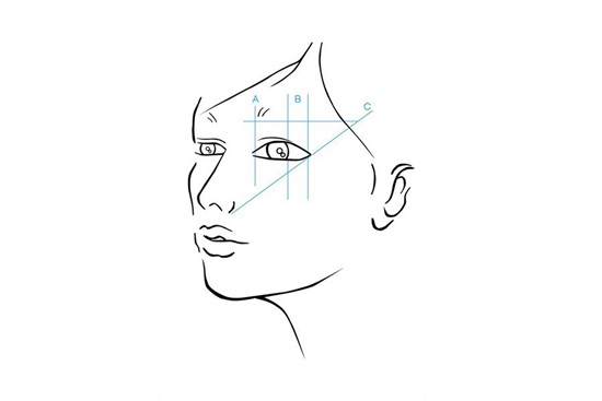 จุด C: เส้นสมมุติที่ยื่นออกมาจากปลายจมูกเฉียงยาวเป็นจุดตัดที่ปลายตาลากยาวขึ้นมาเป็นตำแหน่ง C คือตำแหน่งของระดับคิ้วที่ดี โปรดจำไว้ว่าขนคิ้วนั้นไม่ควรสูงหรือต่ำเกินไป