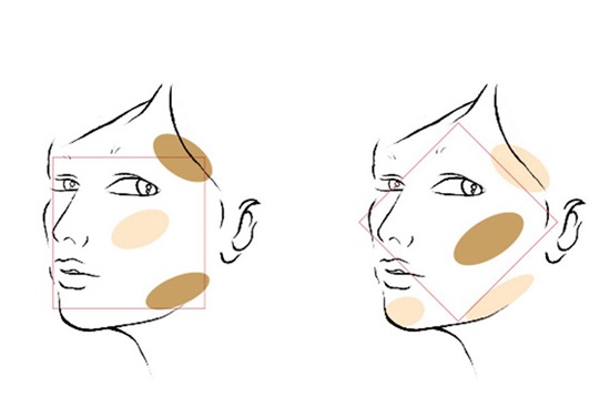 สาวรูปหน้าทรงสี่เหลี่ยม : สาวใบหน้าเหลี่ยมต้องลงบรอนเซอร์ปรับใบหน้าตรงกระดูกขากรรไกรล่างและกรอบหน้าด้านข้างสองฝั่งเพื่อลดมุมเหลี่ยมปรับใบหน้าดูนุ่มนวลขึ้น พร้อมท้งลงไฮไลท์ให้โหนกแก้มสว่างเพื่อสร้างจุดเด่นของใบหน้าให้ดูเรียวขึ้นกว่าเดิม