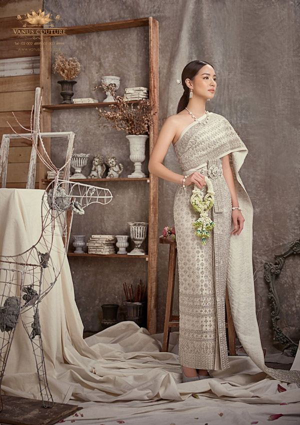 ชุดไทยประยุกต์ ไหล่เฉียงเดรปผ้าไหมสีขาวงาช้าง เพิ่มสไบชีฟองด้านหลังยาว กระโปรงสีเทา ปักบายดอกพิกุล ปักเทาเงิน เครื่องประดับเงินประดับเพชรซีกสีขาว