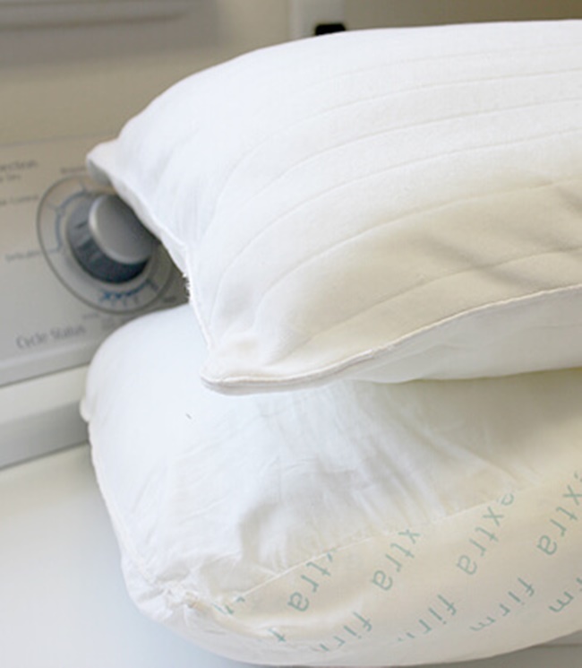 1. เช็คป้ายแท็กบนหมอนก่อนว่าสามารถซักเครื่องได้มั้ย เมื่อแน่ใจก็ถอดปลอกหมอนออกให้หมดเลย