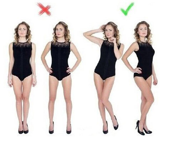 ยืนตรงๆ อาจทำให้เห็นน่อง และไขมันที่ต้นขา ยืนบิดตัวหน่อย ก็ดูสวยขึ้น