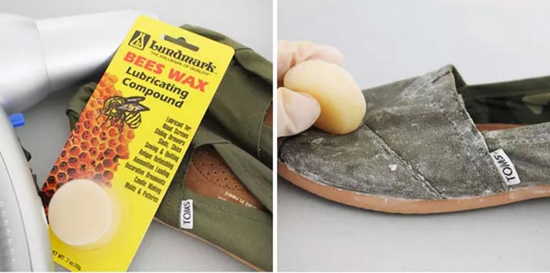 ง่ายๆเเค่ 2 ขั้นตอนเท่านั้น เพียงนำเทียนไข ขี้ผึ้ง หรือพาราฟิน เเว็กซ์ (เลือกอย่างใดอย่างหนึ่ง) มาทาให้ทั่วรองเท้าผ้าใบคู่เก่งของคุณ