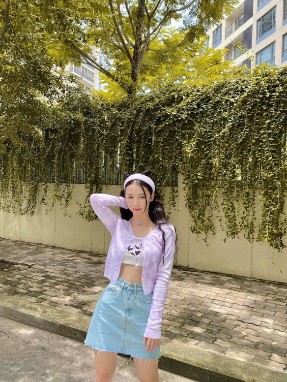 น่ารัก ๆ กับกระโปรงยีนส์สั้น ใส่กับเสื้อสายเดี่ยว คลุมทับด้วยเสื้อสีม่วง