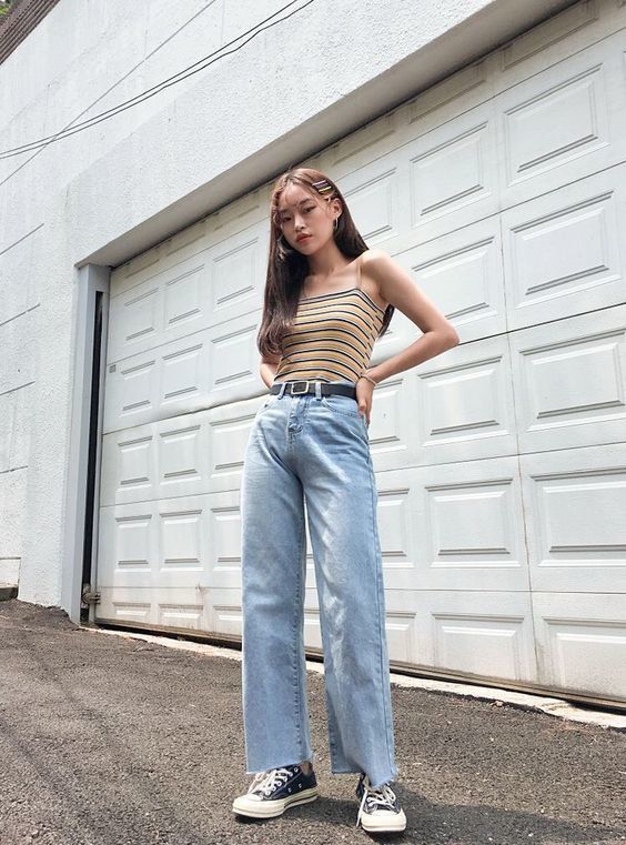 กางเกงยีนส์ขากระบอก พร้อมกับเข็มขัดสีดำ ใส่กับเสื้อสายเดี่ยวสีเหลือง บอกเลยว่าสุดเฟี้ยว