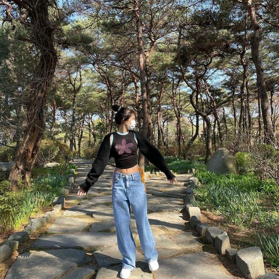 ลุคน่ารัก ๆ กับกางเกงยีนส์อวต่ำ กับเสื้อครอปสีดำ คลุมด้วยเสื้อสีดำ