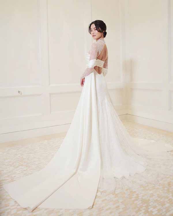 เริ่มต้นกันด้วยชุดเปิดตัวที่สวยปังมากๆค่ะกับชุดงนแถลงข่าว มาในลุคชุดเจ้าสาวผ้าลูกไม้ตัดต่อจากแบรนด์ Milin หรือ Milin FrontRow Wedding เป็นชุดเจ้าสาวสุดเซ็กซี่ ช่วงตัวด้านบนแต่งโดยผ้าลูกไม้สวยหวาน ตัวผ้าเกาะอกทรงบิดไขว้ด้านหน้าที่แต่งตัวผ้ายาวไปด้านหลัง หยิบมาคล้องแขนได้สวยสง่า ตัวกระโปรงยาวสีขาวที่คลุมทับด้วยผ้าลูกไม้อีกชั้น