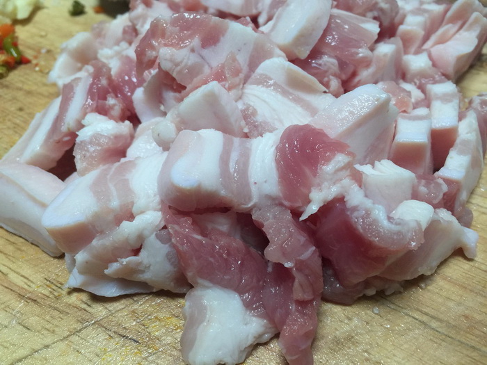 1. หมูสามชั้นหั่นเป็นชิ้นพอดีคำ