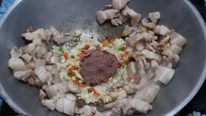 7. กวาดหมูจากขอบกระทะลงมาผัดให้เข้ากับกระเทียม พริกสด และ กะปิ ปรุงรสด้วยน้ำปลาหรือซอสปรุงรส น้ำตาล ผงอูมามิ