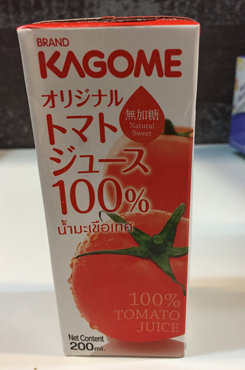 ตัวนี้กล่องสีแดงสะดุดตามาแต่ไกล หน้ากล่องเขียนว่า น้ำมะเขือเทศ 100%
