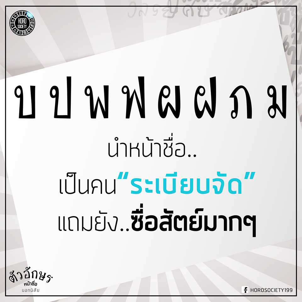คนที่มีอักษร บ ป พ ฟ ผ ฝ ภ ม นำหน้าชื่อ มักเป็นคนที่มีหลักการ แบบแผน มีความซื่อตรง เชื่อในคุณธรรม ศีลธรรม มีความเป็นระเบียบ เรียบร้อย มีกฎเกณฑ์กติกามากมาย ทั้งยังมีความเมตตากรุณาเห็นอกเห็นใจผู้อื่น จึงมีอัธยาศัยไมตรี เอื้อเฟื้อเผื่อแผ่ กตัญญูกตเวที รักเหตุผล ซื่อสัตย์สุจริต แต่บางครั้งคุณธรรมที่มีก็เสื่อมลงทำให้ขาดความเห็นอกเห็นใจ ชอบซ้ำเติมผู้ที่ตกต่ำ ขาดเหตุผล และไม่ซื่อตรงได้